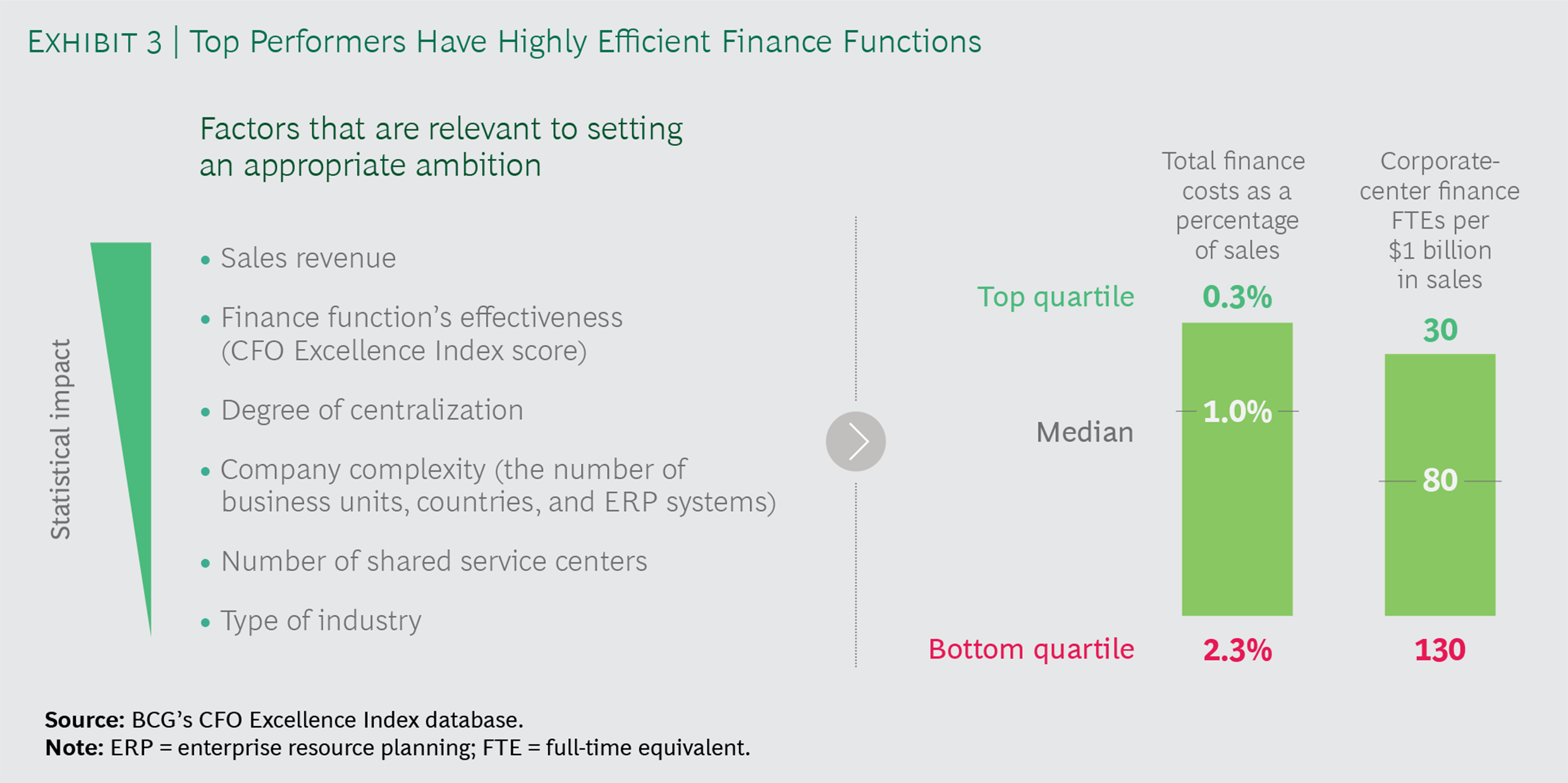 Các giám đốc tài chính cũng nên so sánh chức năng tài chính với các công ty cùng ngành trên cơ sở số lượng đầu người và chi phí. Điểm chuẩn này có thể tiết lộ các phòng ban hoặc khu vực hiện đang tụt hậu về hiệu quả chi phí. Phân tích cơ sở dữ liệu cho Chỉ số CFO xuất sắc của BCG, chúng tôi nhận thấy rằng tổng chi phí của các chức năng tài chính tốt nhất trong phân khúc luôn nằm trong khoảng 0,3% đến 1,0% doanh thu.