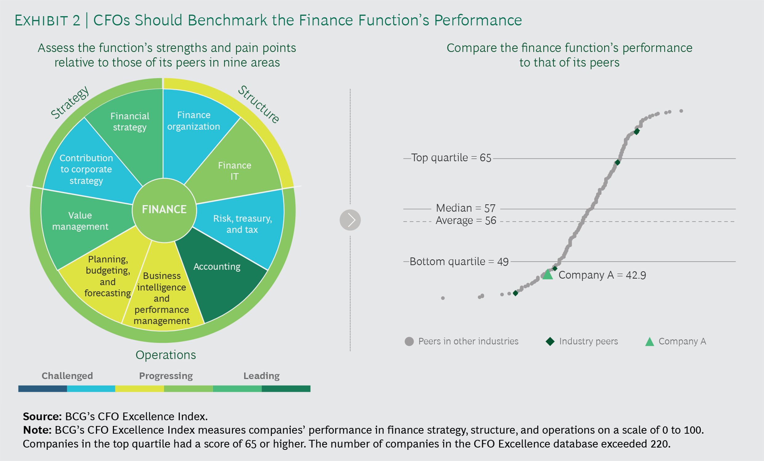 Ví dụ: Chỉ số CFO xuất sắc của BCG đánh giá hiệu quả hoạt động của một chức năng tài chính so với các công ty cùng ngành trong ngành của chính công ty đó và trong các lĩnh vực khác trên chín lĩnh vực. Đánh giá này giúp xác định những thách thức và nguồn gốc của lợi thế cạnh tranh. Bằng cách làm nổi bật các khoảng cách giữa hiệu suất hiện tại của chức năng tài chính và các hoạt động khác của nó, một số trong số đó có thể xếp hạng trong nhóm hàng đầu, phân tích cho thấy các cơ hội cải thiện tiềm năng.