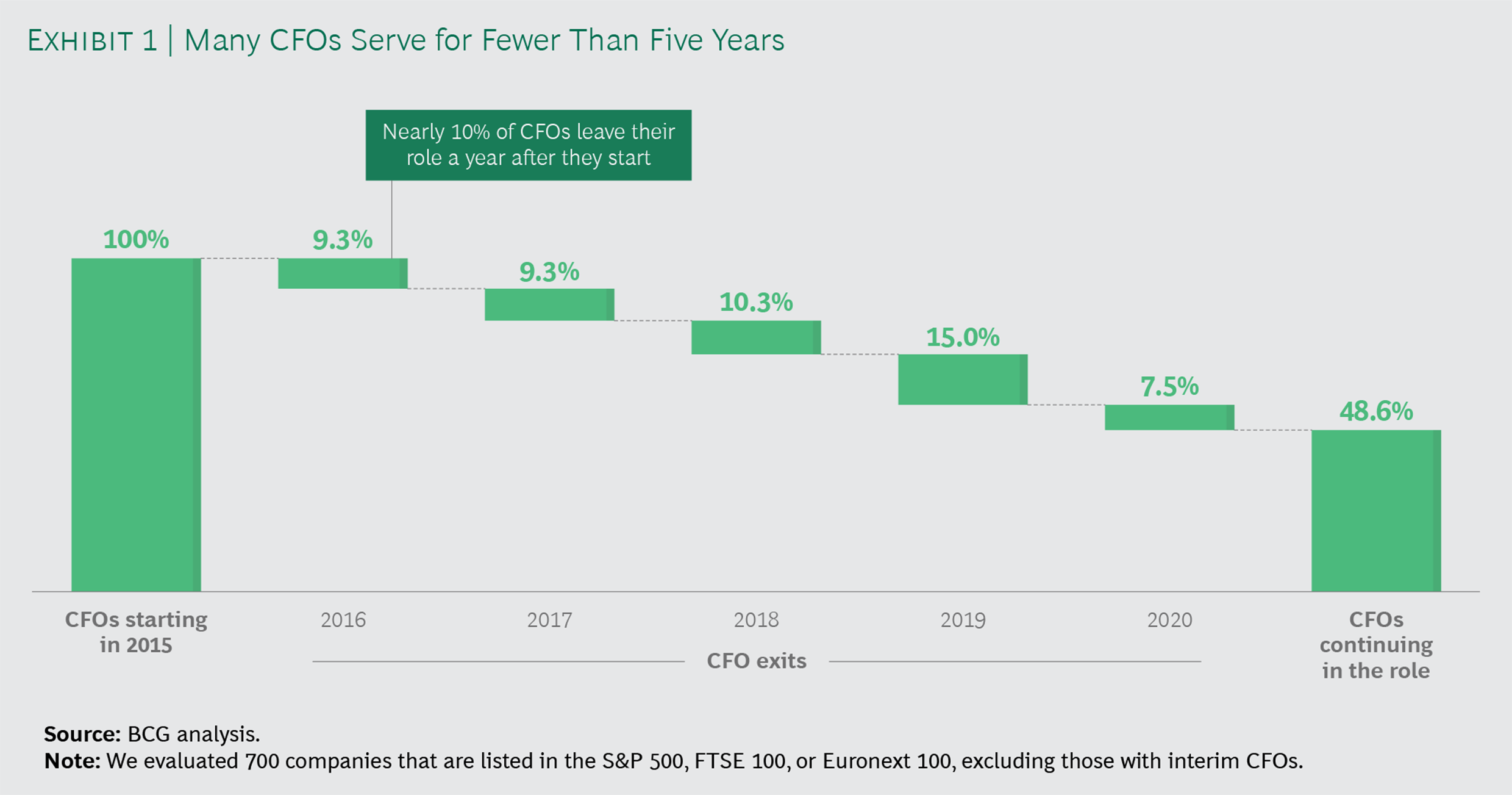 Phạm vi của các thách thức dường như đang ảnh hưởng đến nhiệm kỳ của một số CFO. Một phân tích của BCG cho thấy gần 10% giám đốc tài chính tại các công ty hàng đầu rời bỏ vai trò của họ trong vòng một năm sau khi họ bắt đầu công việc. Và hơn 50% đã rời đi vào cuối năm thứ năm. Nhiệm kỳ ngắn hạn không cho CFO đủ thời gian để hiểu đầy đủ về công ty hoặc ngành của công ty và các xu hướng ảnh hưởng đến họ. Kết quả là, giám đốc tài chính không thể có tác động có ý nghĩa đến tổ chức và để lại di sản mong muốn.