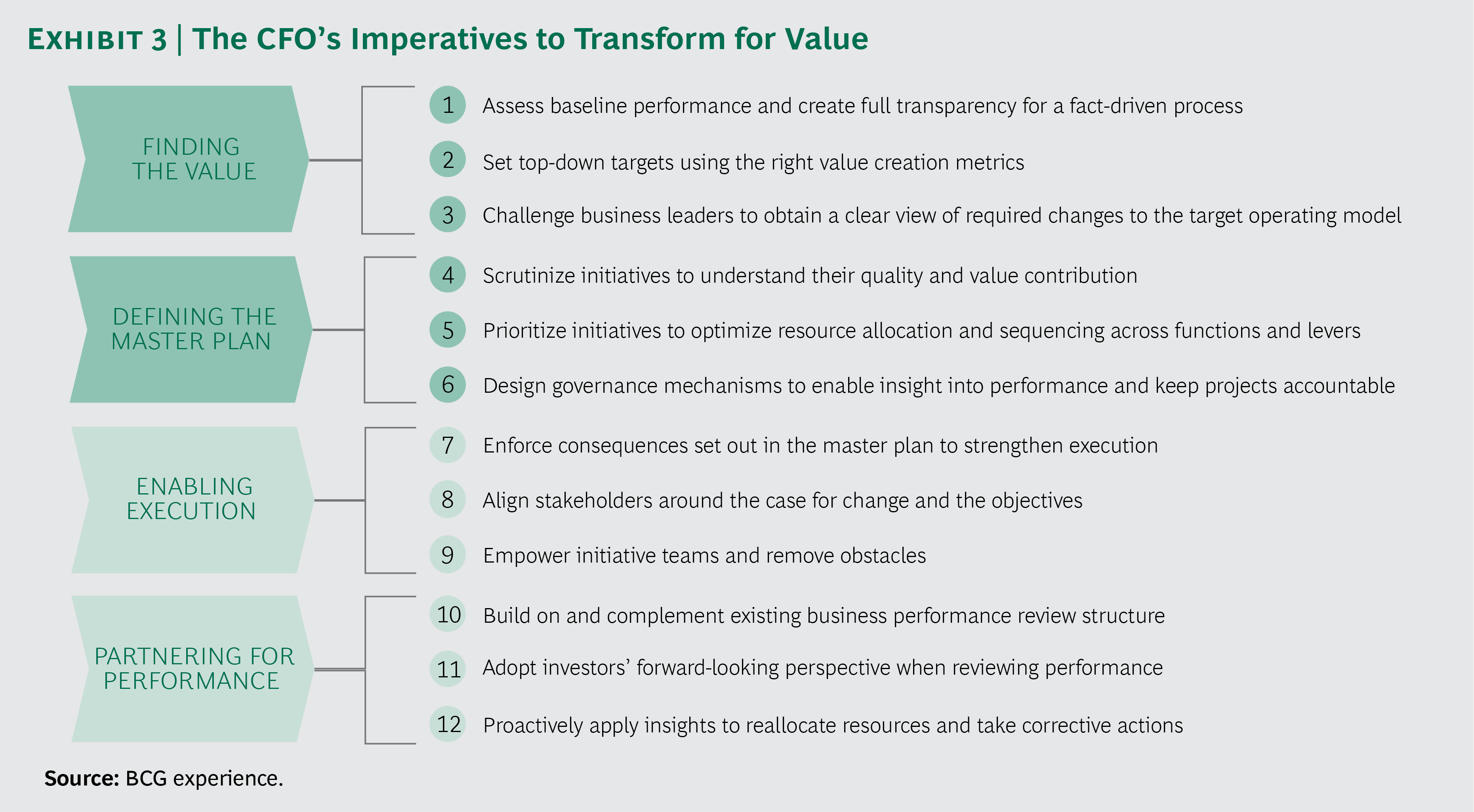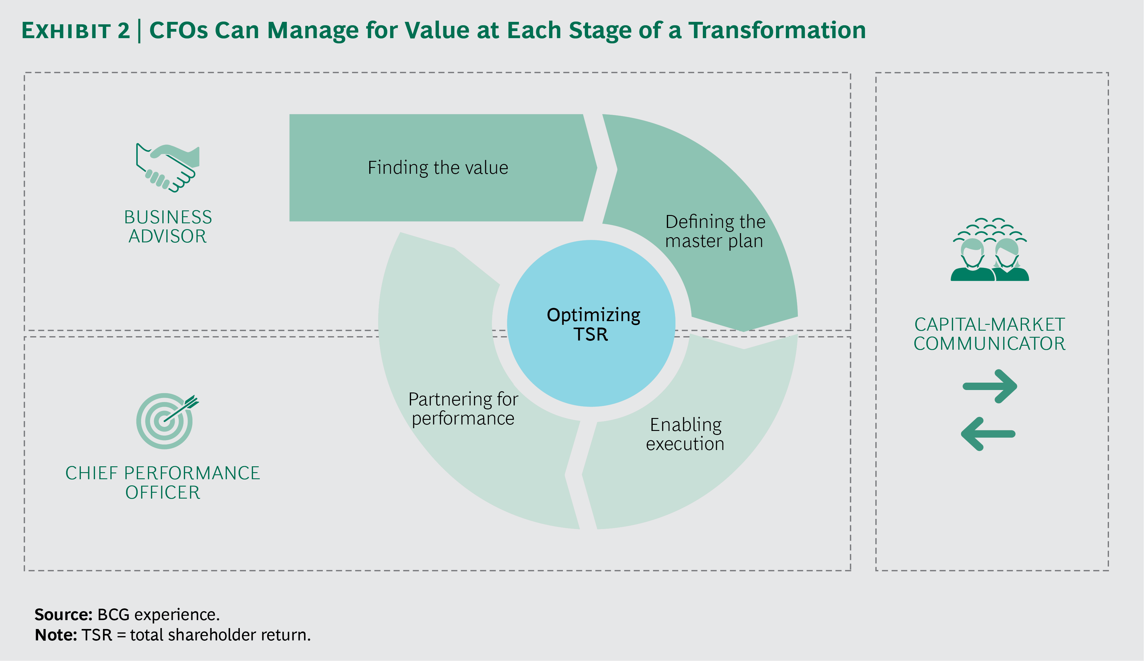 Phạm vi trách nhiệm lớn hơn khiến các CFO có vị trí đặc biệt tốt để hiểu các nguồn giá trị, đặt ra các mục tiêu cải tiến dựa trên thực tế, tối ưu hóa việc phân bổ nguồn lực và đảm bảo trách nhiệm giải trình cho các kết quả. Để duy trì sự tập trung không ngừng vào việc tạo ra giá trị, các CFO phải đóng một vai trò quan trọng trong từng giai đoạn của quá trình chuyển đổi.